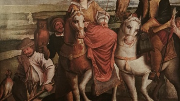 sehr schönes, farbiges Gemälde mit einem Harlekin und Affen